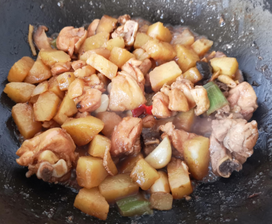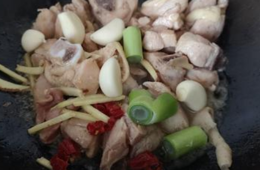 油锅里炒香葱、姜、蒜、红辣椒,加入鸡架炒香后加酱油、料酒,翻炒二三分钟后倒入水后焖十五分钟;