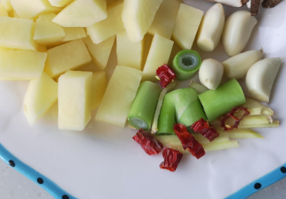 土豆、鸡架洗净改刀备用,葱、姜、蒜、红辣椒改刀;