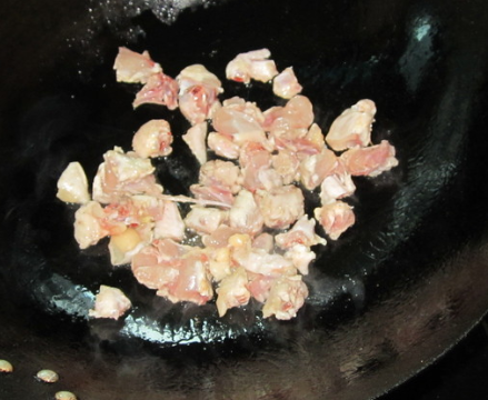 先炒鸡丁,撒上盐,淋上醋或料酒炒片刻;
