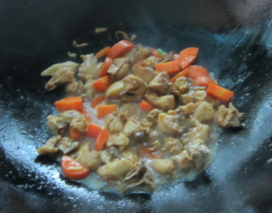 添加适量清水,将红萝卜和鸡丁焖香焖熟;