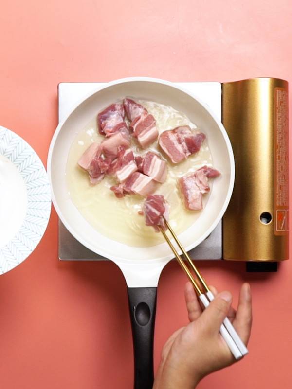 2、锅中放油,油温烧至五成热,放入五花肉,中小火煎至七成熟。