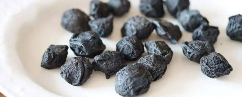 药材性状:呈类球形或扁球形,直径1.5~3cm,表面乌黑色或棕黑色,皱缩不平,基部有圆形果梗痕。果核坚硬,椭圆形,棕黄色,表面有凹点;种子扁卵形,淡黄色。气微,味极酸。