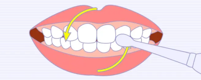 刷牙的外侧时,牙刷以画圆弧的动作、画圆圈的方式呈顺时针刷牙。刷牙齿内侧时,刷毛放置磨牙内侧面拂刷。刷尖牙及门牙内侧时,将刷柄竖起用牙刷顶端部位刷牙。