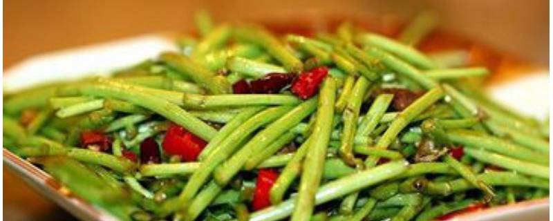 6、肥肉炒至透明时,放入黎蒿,大火翻炒。
