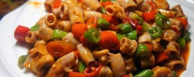 2、清理干净的大肠焯水后备用。青红椒去柄去籽,洗净后切成块状,洋葱去外皮清洗干净后切片备用。