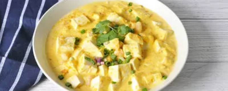 用料:豆腐200克、咸蛋黄2个、食用油1汤匙、洋葱、葱一段、盐1克。