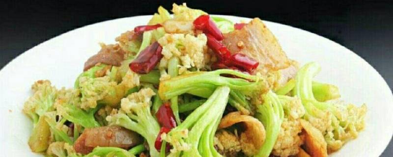 步骤11、煸炒至肉片完全变色,倒入菜花。