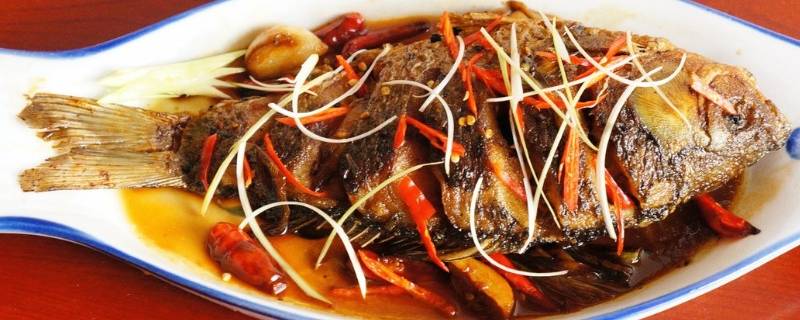 鲫鱼一条、蒜头10克、生姜5克、香菜3克、生抽2匙、老抽1匙、料酒2匙、盐3克、糖2匙。