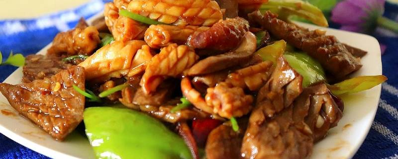 8、腰花面色,没有了鲜肉色便可放入双椒翻炒,放盐、鸡精。
