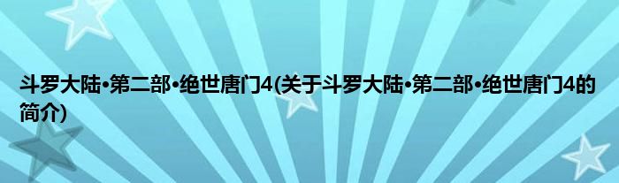 最佳答案大家好,斗罗大陆·第二部·绝世唐门4,关于斗罗大陆·第二部·绝世唐门4的简介很多人还不知道,现在让我们一起来看看吧! 1、 《斗罗大陆》是湖南少年儿童出版社出版的一本图书,作者唐家三少。本文关于斗罗大陆·第二部·绝世唐门4的简介就讲解完毕,希望对大家有所帮助。