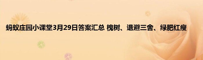 蚂蚁庄园小课堂2021年3月29日的题目更新了,今天一共有3个题目,分别是哪种槐树的花可以吃?退避三舍的舍是多少里?绿肥红瘦中的红瘦,是哪种花?最新题目答案是什么?蚂蚁庄园完成每日最新的题目可以获得180g饲料。我们可以用饲料喂养小鸡。那么蚂蚁庄园3月29日的答案是什么呢?一起来看看吧。