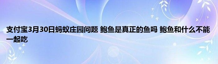 小编今天给各位玩家朋友们带来的是支付宝3月30日蚂蚁庄园问题 鲍鱼是真正的鱼吗 鲍鱼和什么不能一起吃,有记得的玩家朋友吗?不记得也没有关系,小编已经帮助大家把支付宝3月30日蚂蚁庄园问题 鲍鱼是真正的鱼吗 鲍鱼和什么不能一起吃找了出来,你只需要动动你的小手就可以轻松知道啦,快来瞧一瞧吧。