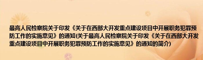 本文关于最高人民检察院关于印发《关于在西部大开发重点建设项目中开展职务犯罪预防工作的实施意见》的通知的简介就讲解完毕,希望对大家有所帮助。