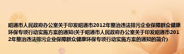 本文关于昭通市人民政府办公室关于印发昭通市2012年整治违法排污企业保障群众健康环保专项行动实施方案的通知的简介就讲解完毕,希望对大家有所帮助。