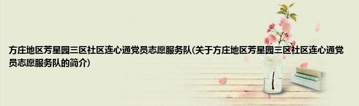 1、 方庄地区芳星园三区社区连心通党员志愿服务队是由方庄地区连心通党员志愿服务队领导下的志愿团体。
